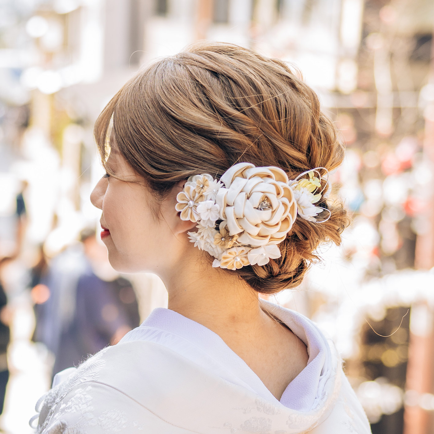 大きめの髪飾りがポイント。前後・どの角度から見ても美しいスタイルです。