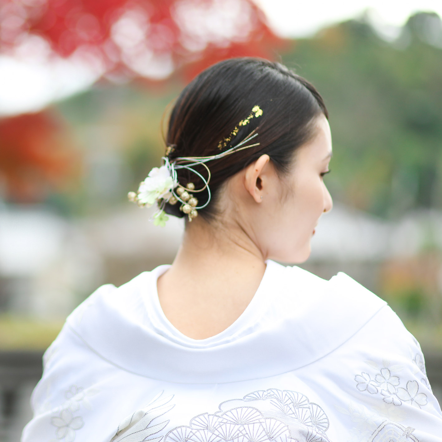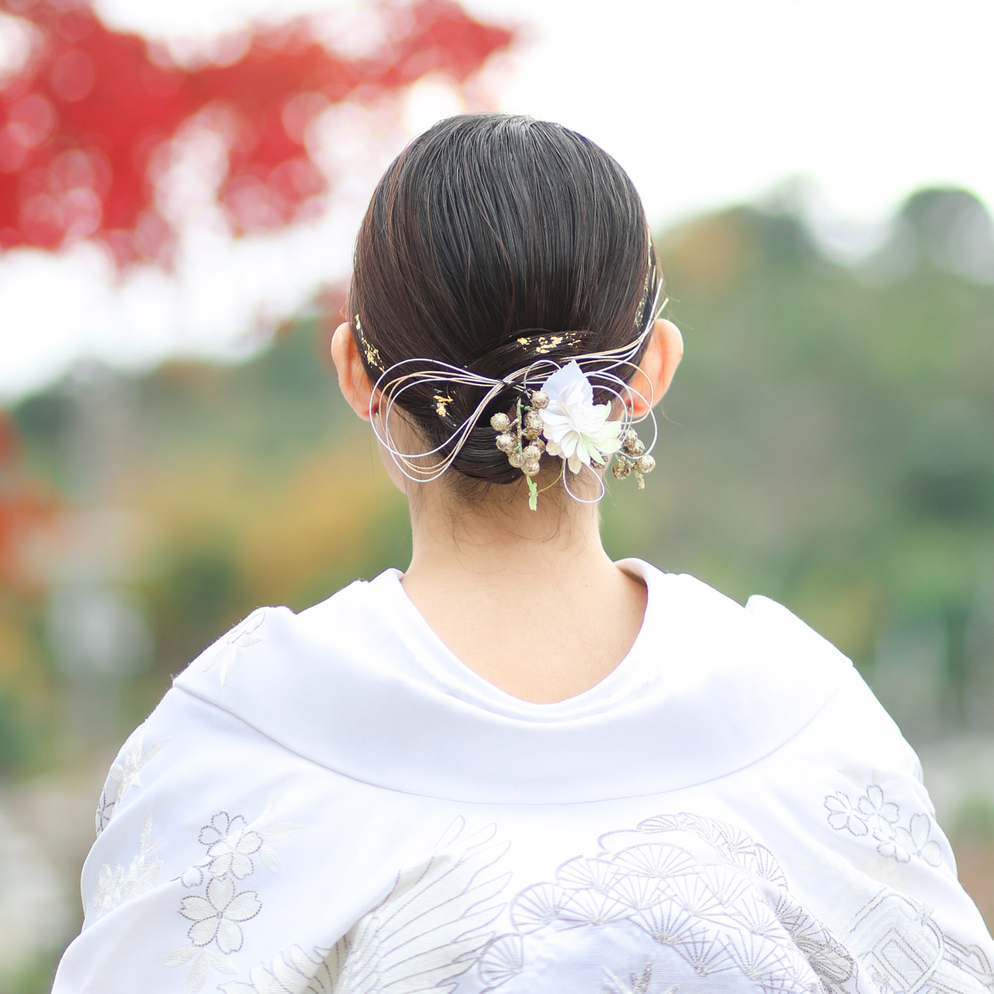 すっきりとまとめたヘアに金箔と水引を飾った、上品な和装ヘアアレンジです