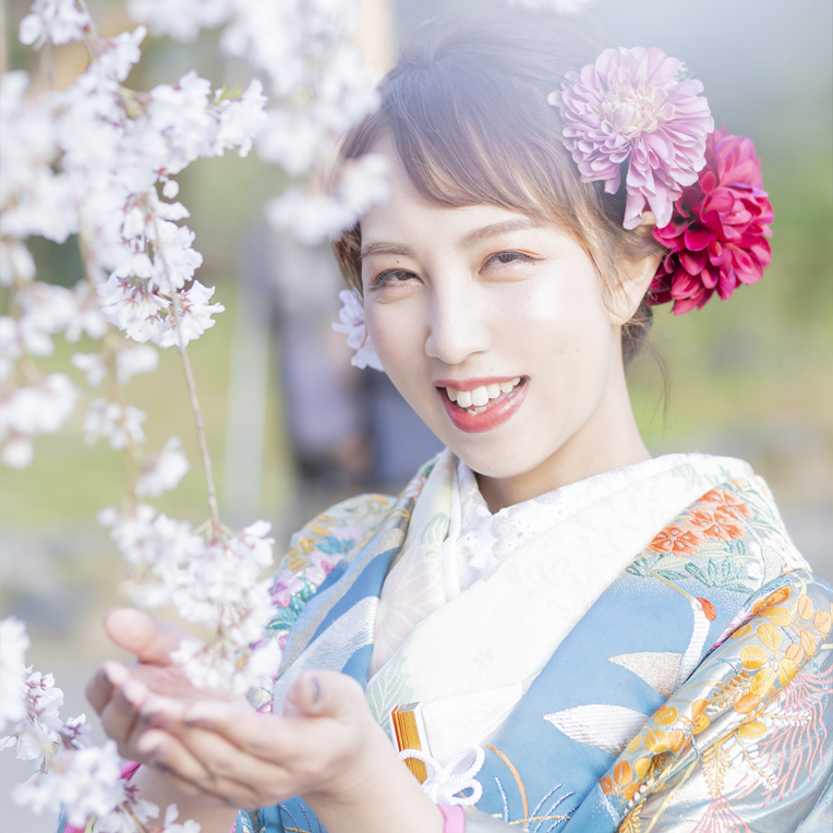 明るい髪色に似合う鮮やかな大花で、お顔まわりを華やかに演出。