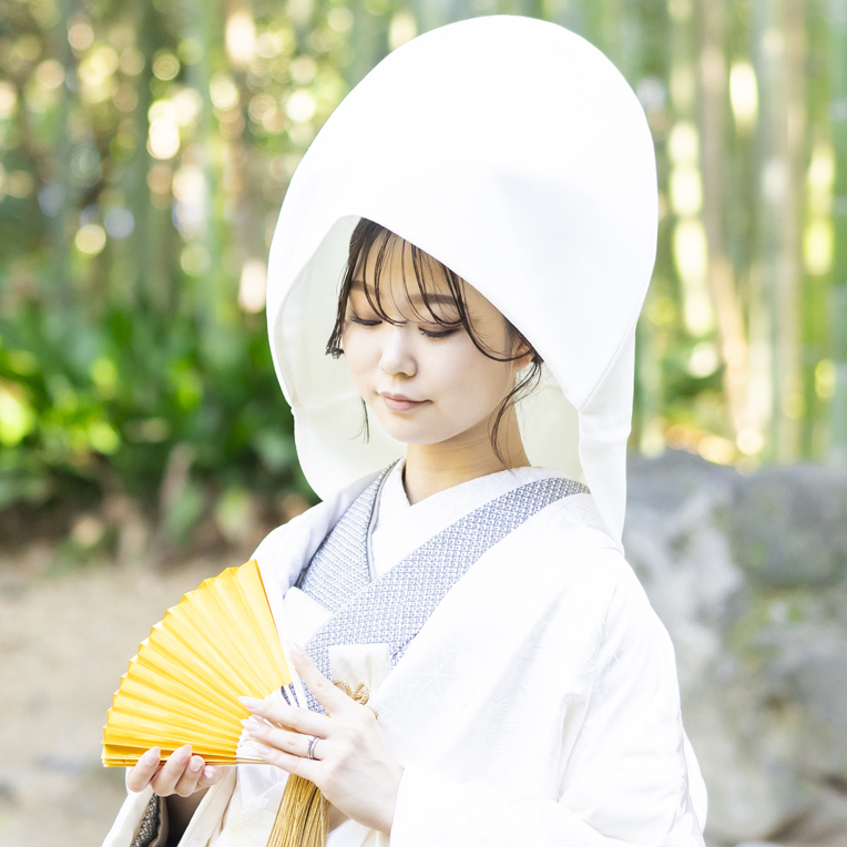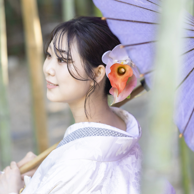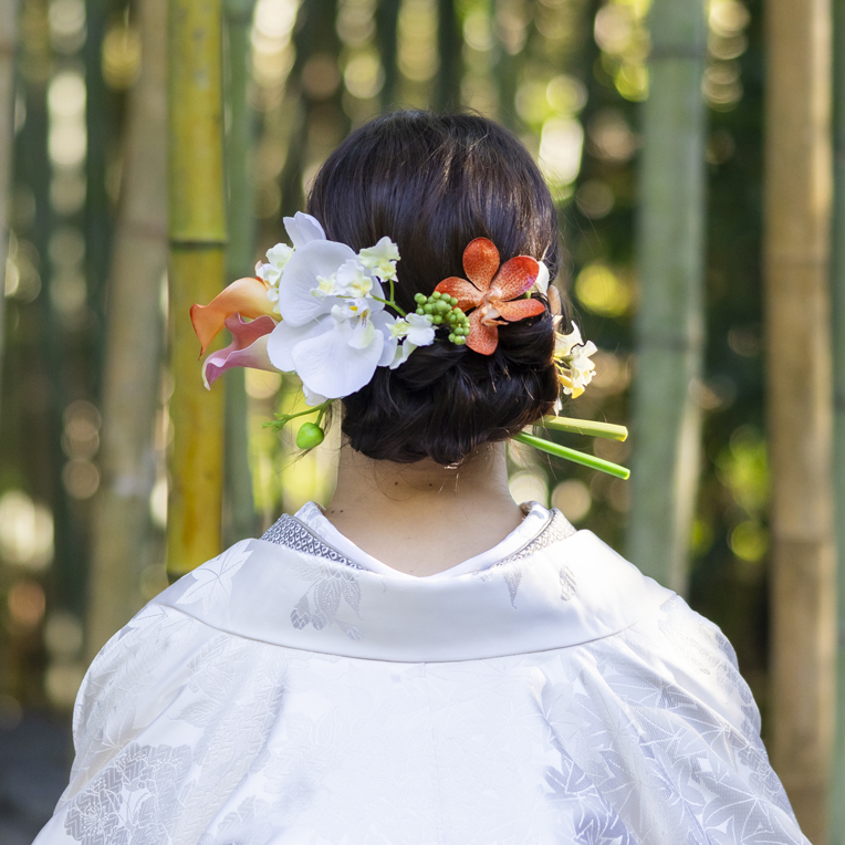 綿帽子をはずすと、大ぶりな花飾りでイメージがガラッと変わるスタイルです